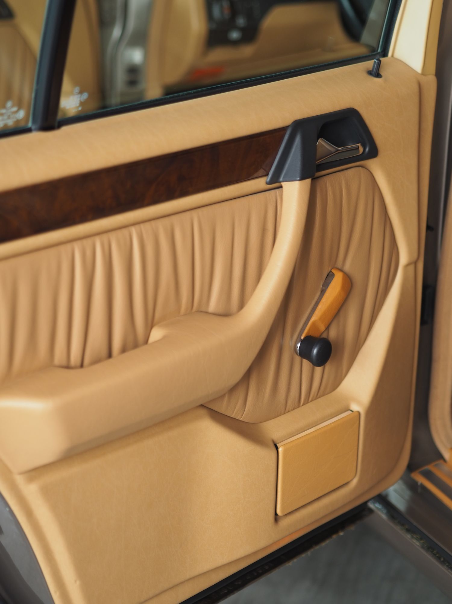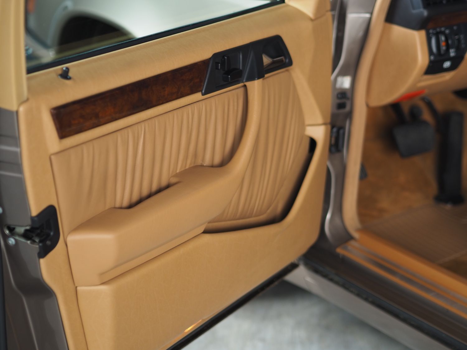 Ein echtes Highlight ist die außergewöhnlich elegante Farbkombination aus Impala-metallic – ein dezenter, edler Braunton – in Verbindung mit Leder Dattel. Diese Innenausstattung verleiht dem Fahrzeug eine warme, klassische Atmosphäre und unterstreicht den souveränen Charakter der Baureihe 124. Abgerundet wird das Interieur durch feines Wurzelnussholz, wie man es heute nur noch selten in dieser Qualität findet.